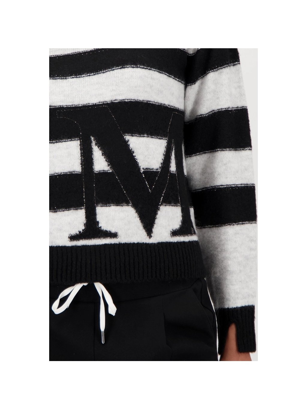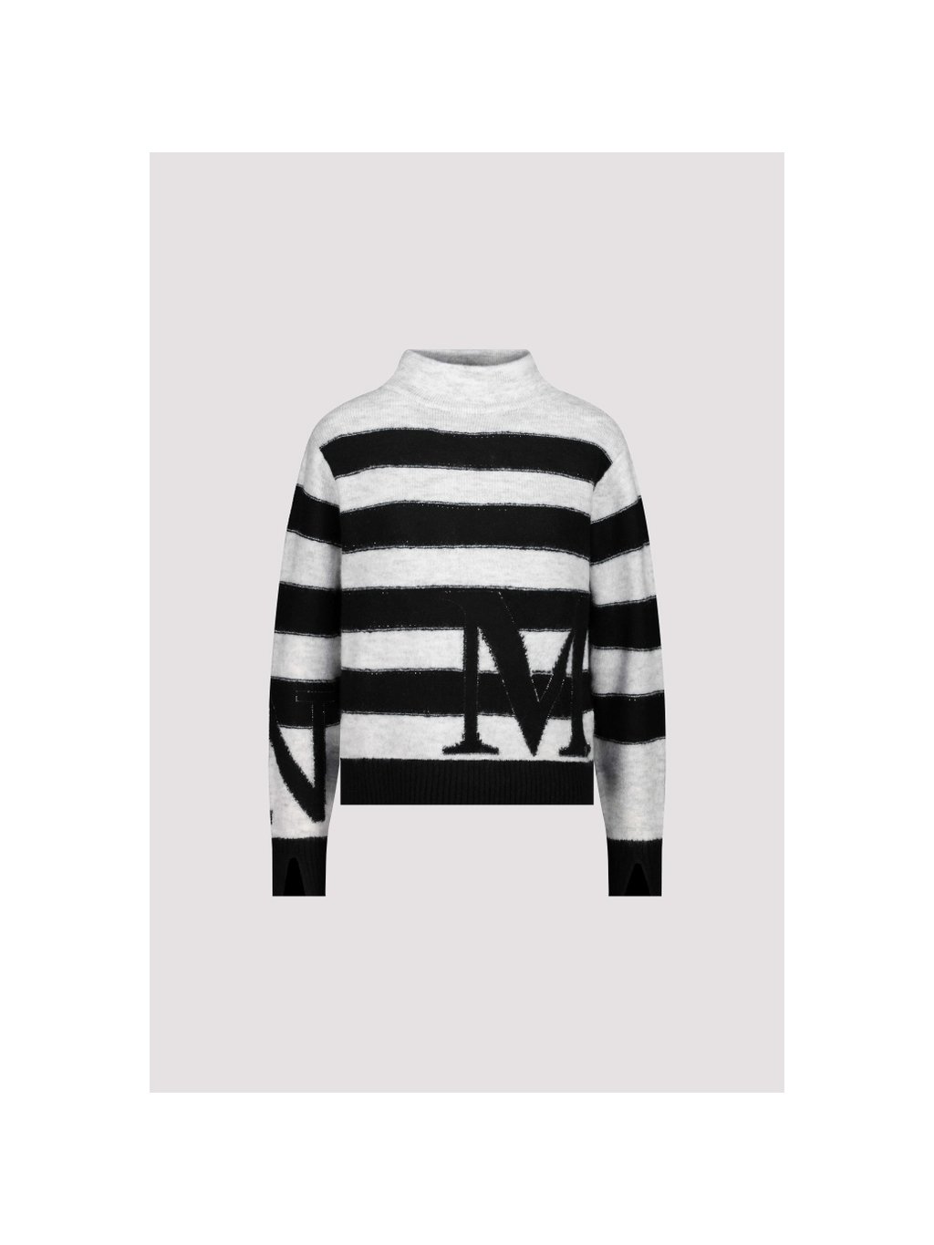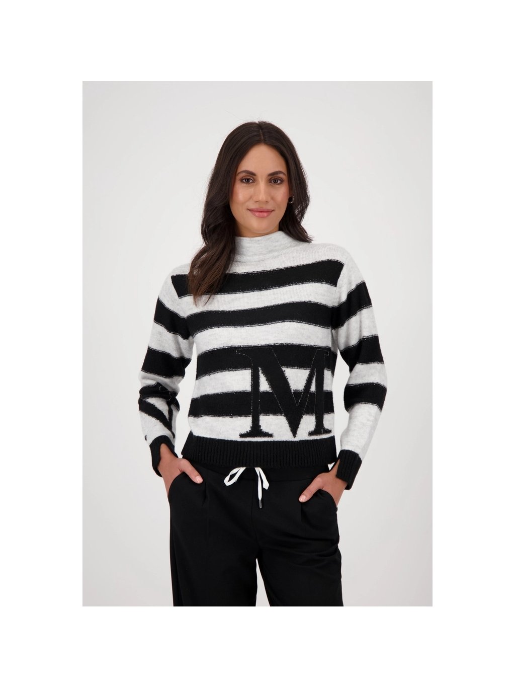 Elegantní svetr z rozevláté viskózy s pruhovaným vzorem, zdobený kamínky, stojáčkem a intarzním vzorem – nutnost pro chladné podzimní dny.
