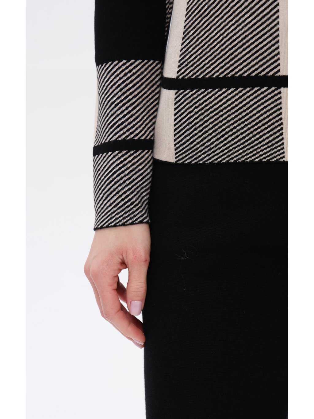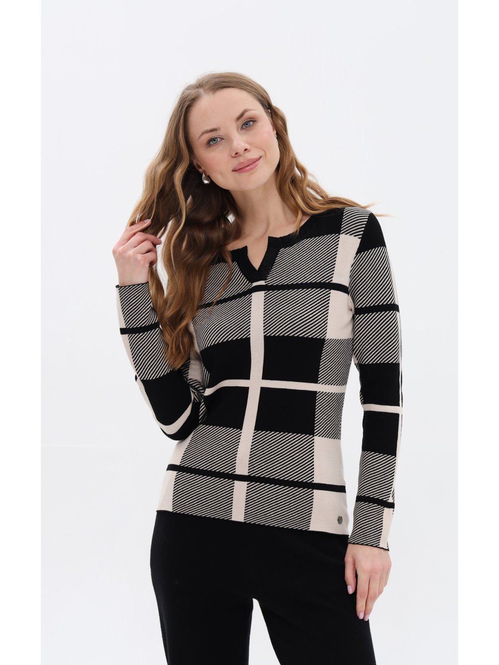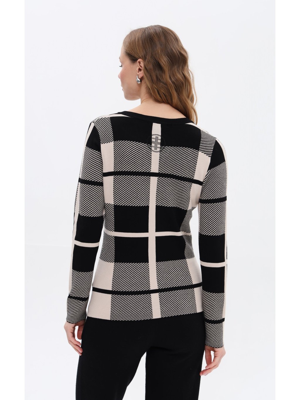 Svetr od Passioni zaujme svým výrazným kostkovaným designem s nadčasovou elegancí,