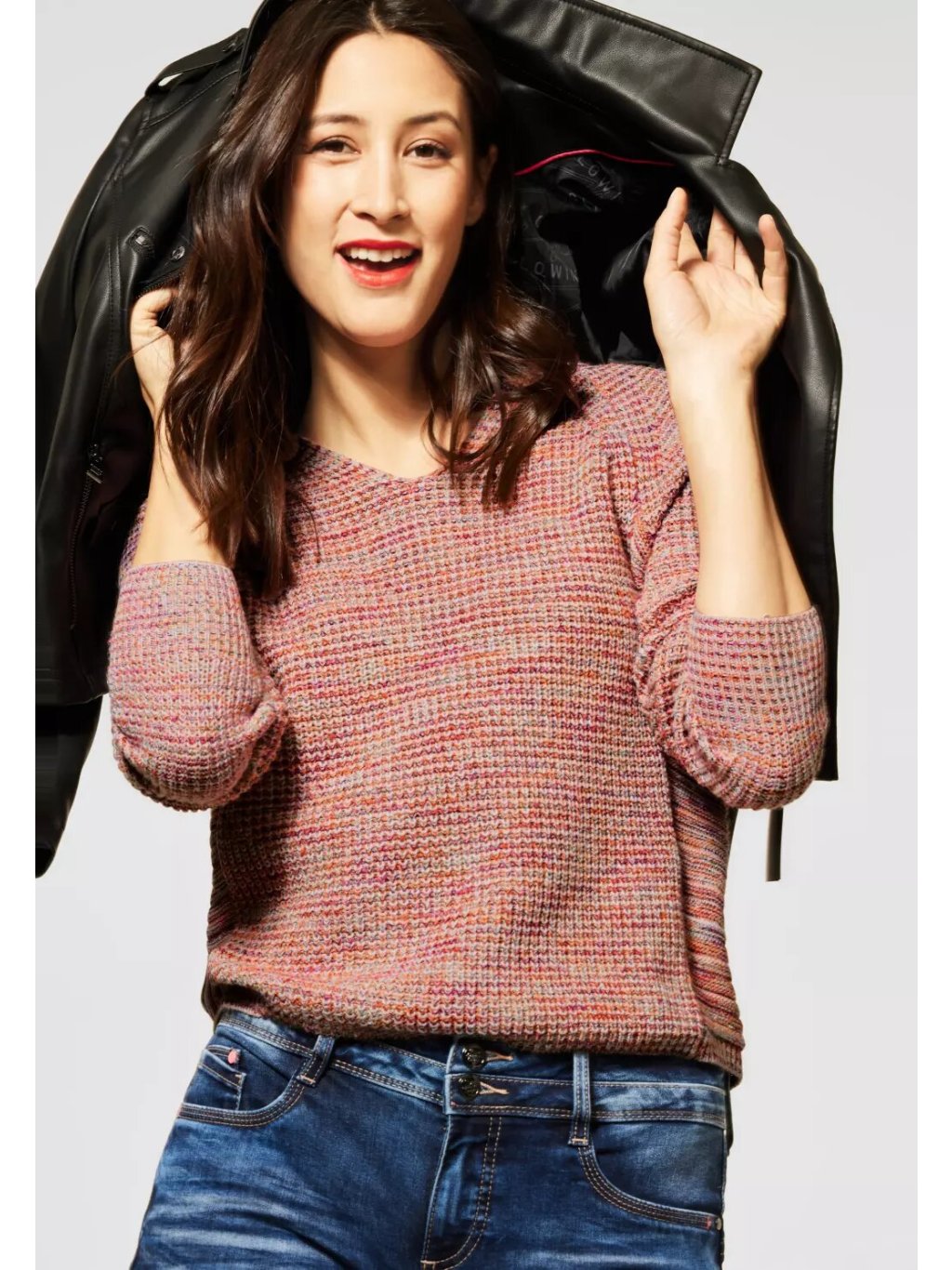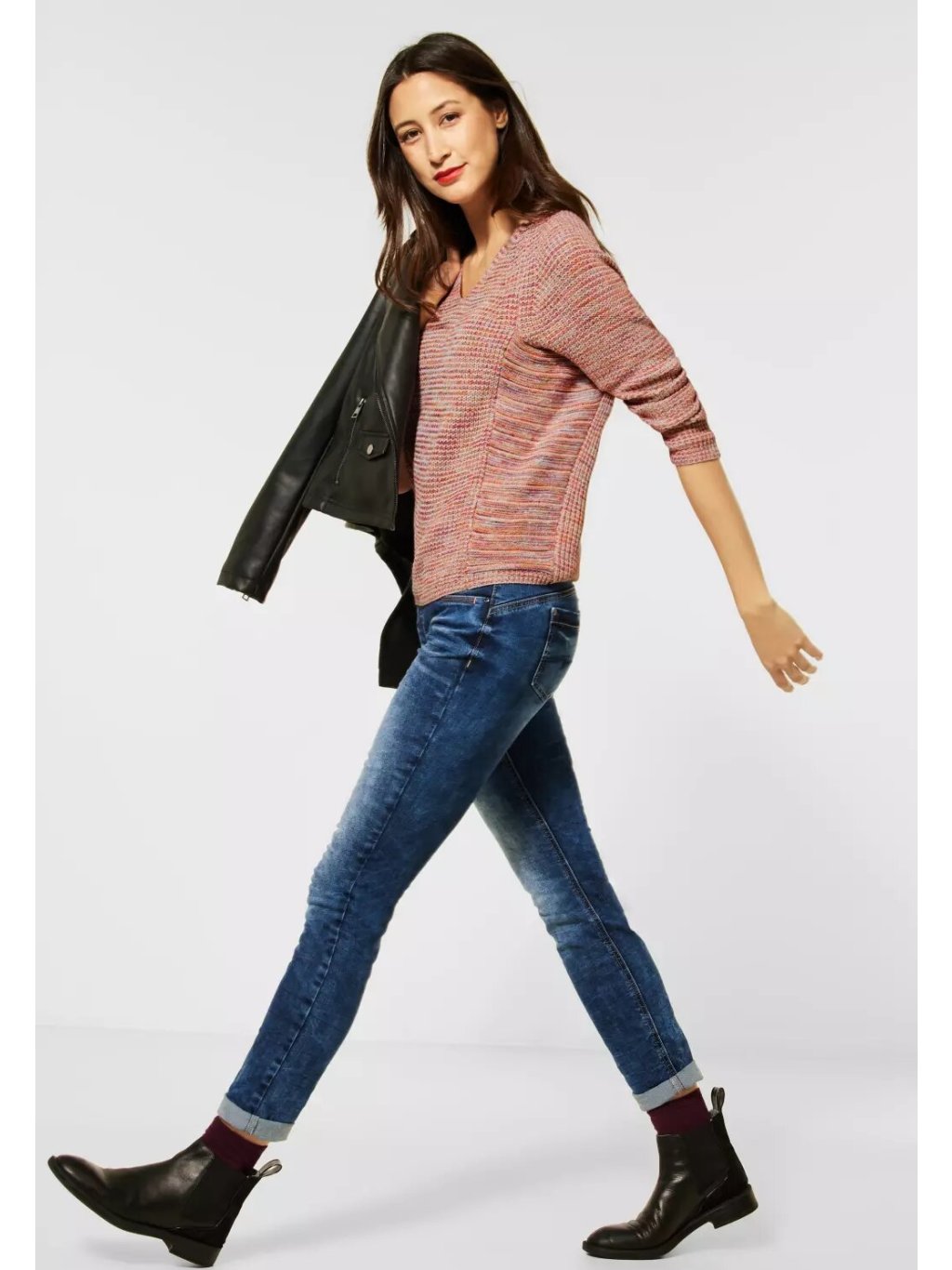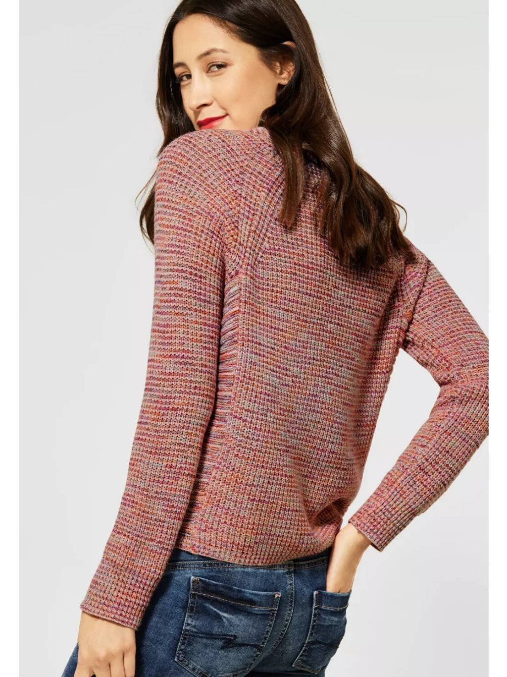 Barevný vzhled doplňuje ženský výstřih do V a raglánové rukávy. Boky svetru jsou jinak pletené a zdůrazňují strukturu svetru. Robustní pletený svetr, mouliné, V-výstřih, raglánové rukávy. Rozměry pro velikost EU přibližně 38:Délka 58 cm, hrudník 58 cm, šířka lemu 48 cm.