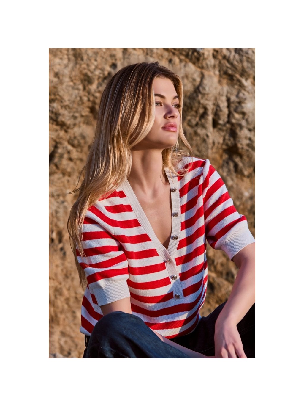 Tento pletený svetr s krátkým rukávem je vyroben ze 100% bavlny a má klasický pruhovaný vzor. Výstřih do V s knoflíky a žebrovaný lem dodávají svetru osobitý vzhled.