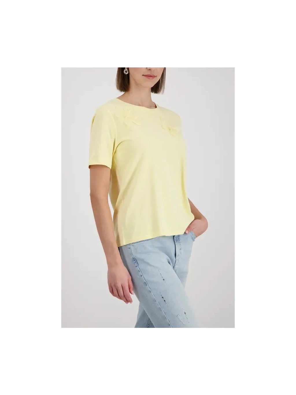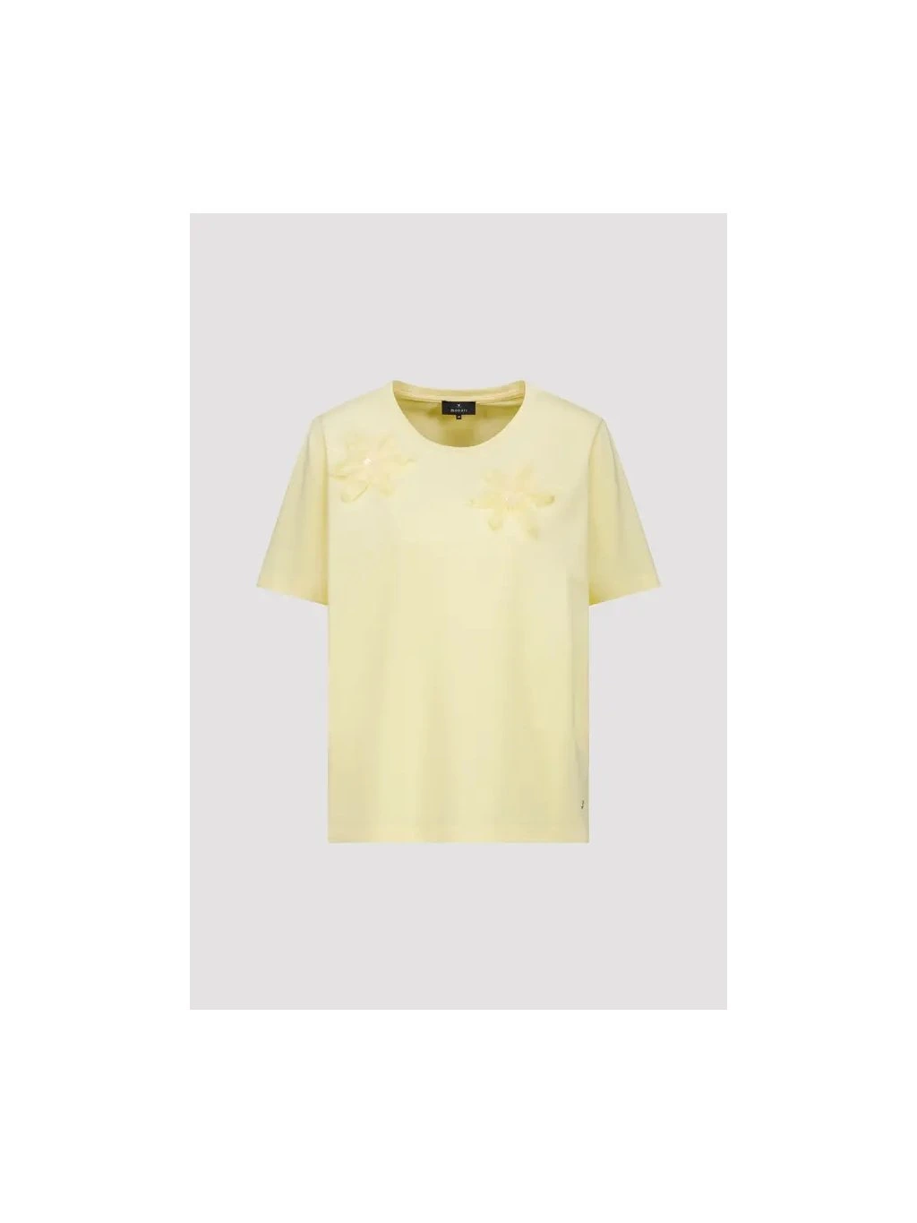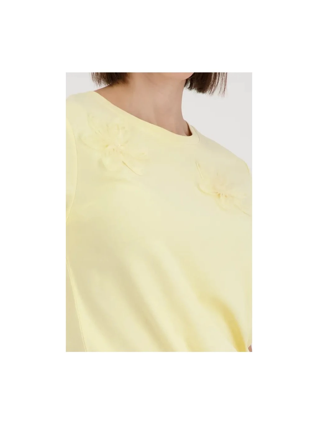 Elegantní tričko s 3D květy, vyrobené z vysoce kvalitní bavlny a modalu, froté vnitřní strana, kulatý výstřih a krátké rukávy.
