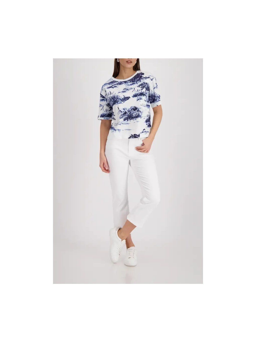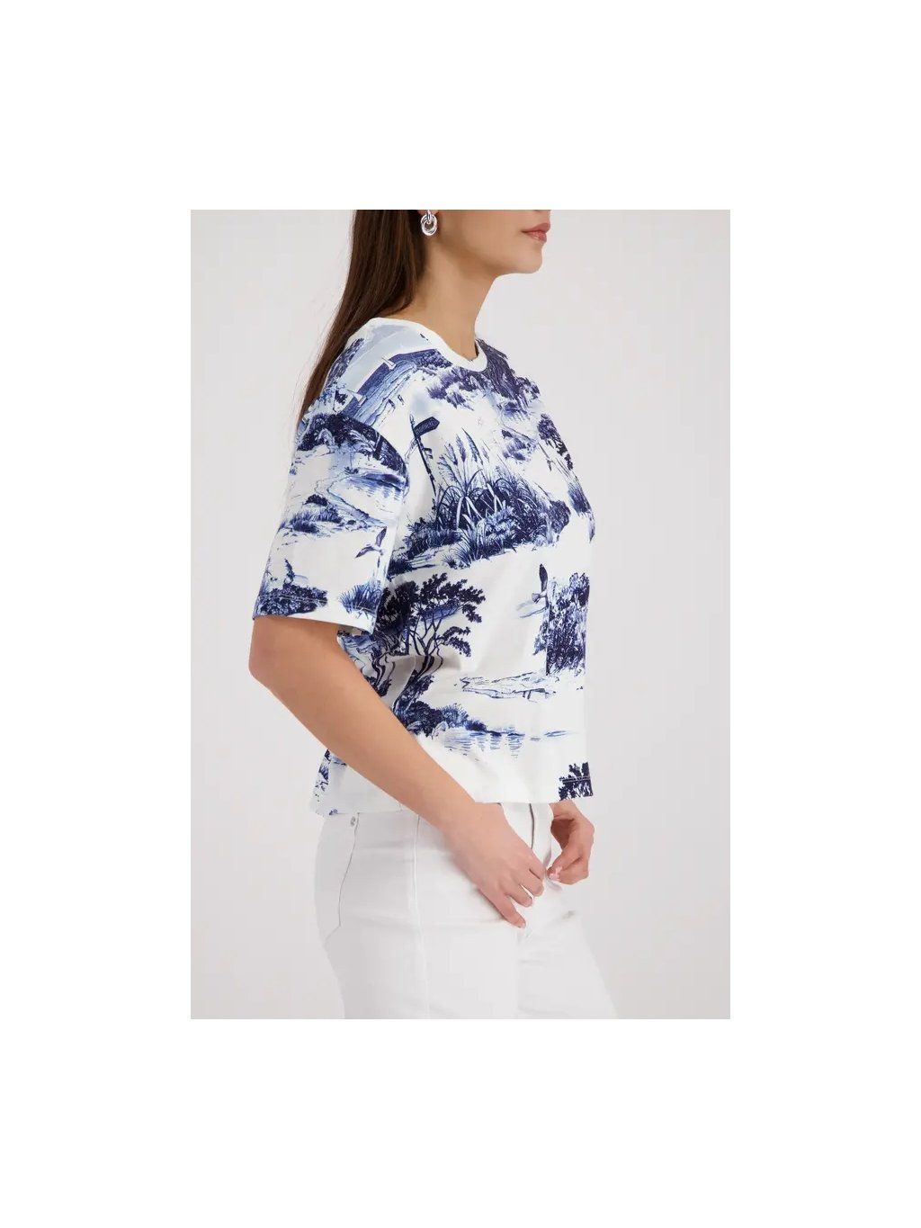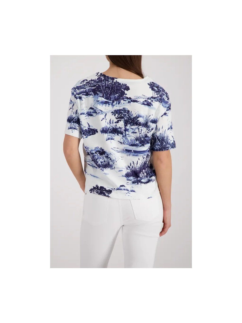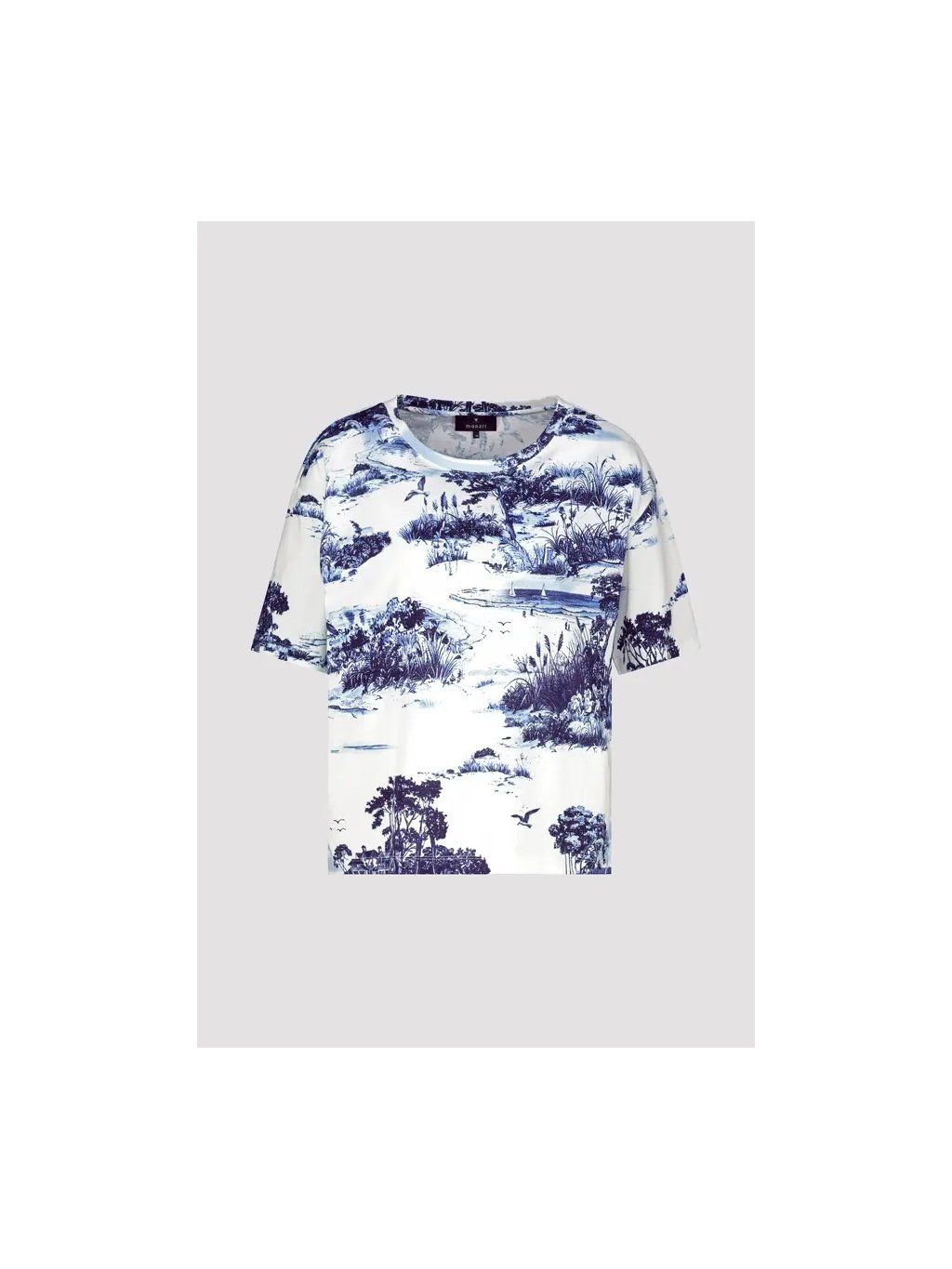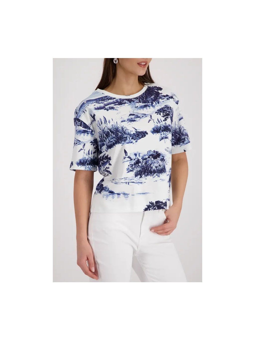 Cítíte se stylově a zároveň pohodlně v našem 100% bavlněném tričku s okouzlujícím krajinářským potiskem a elegantním kulatým výstřihem.