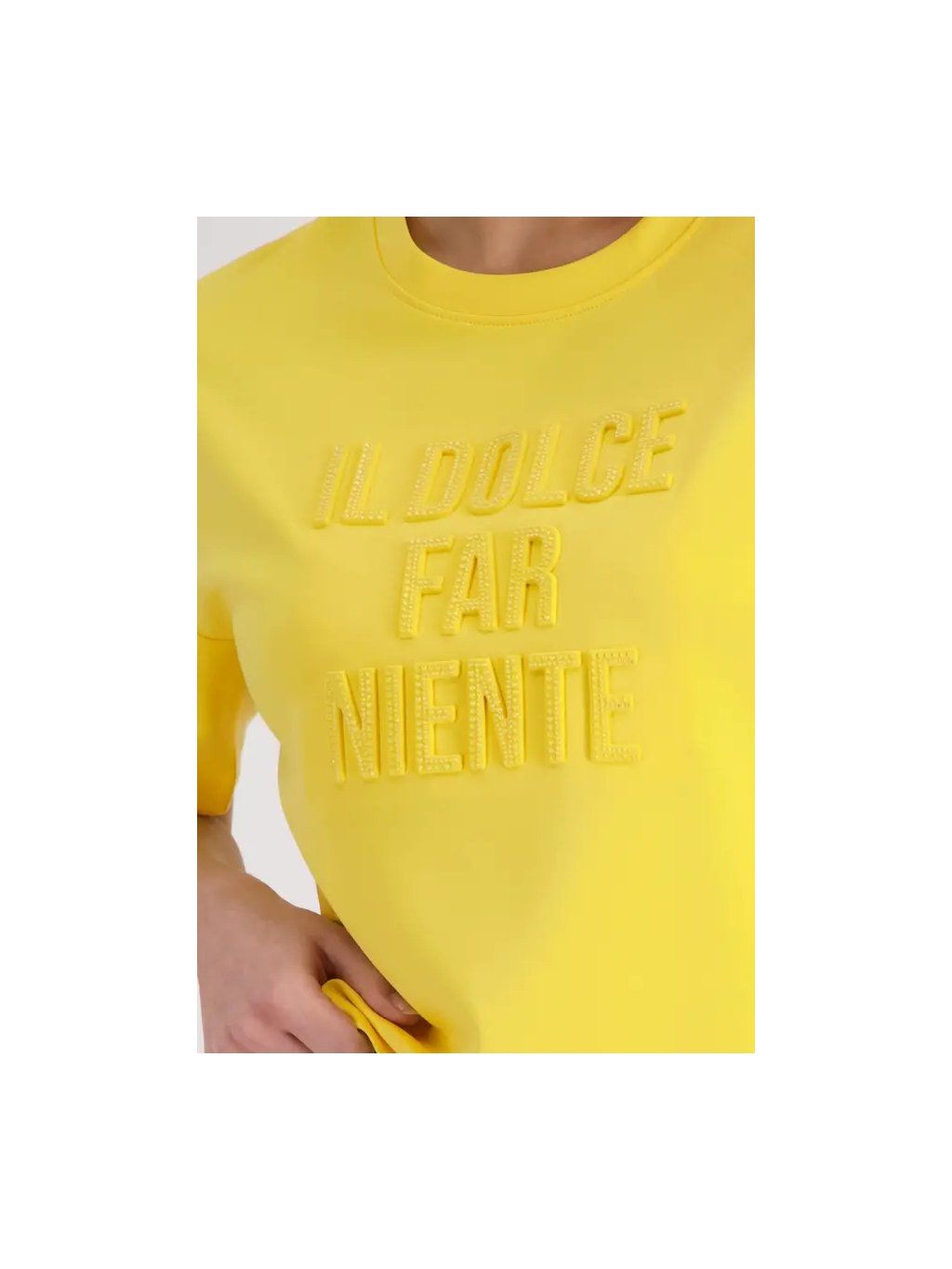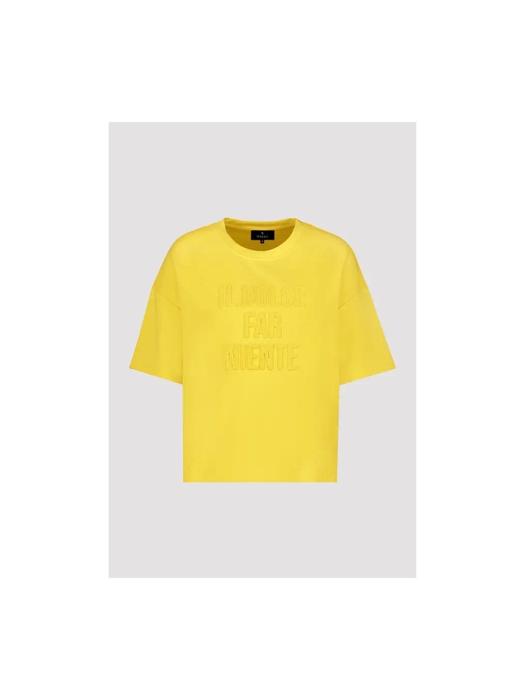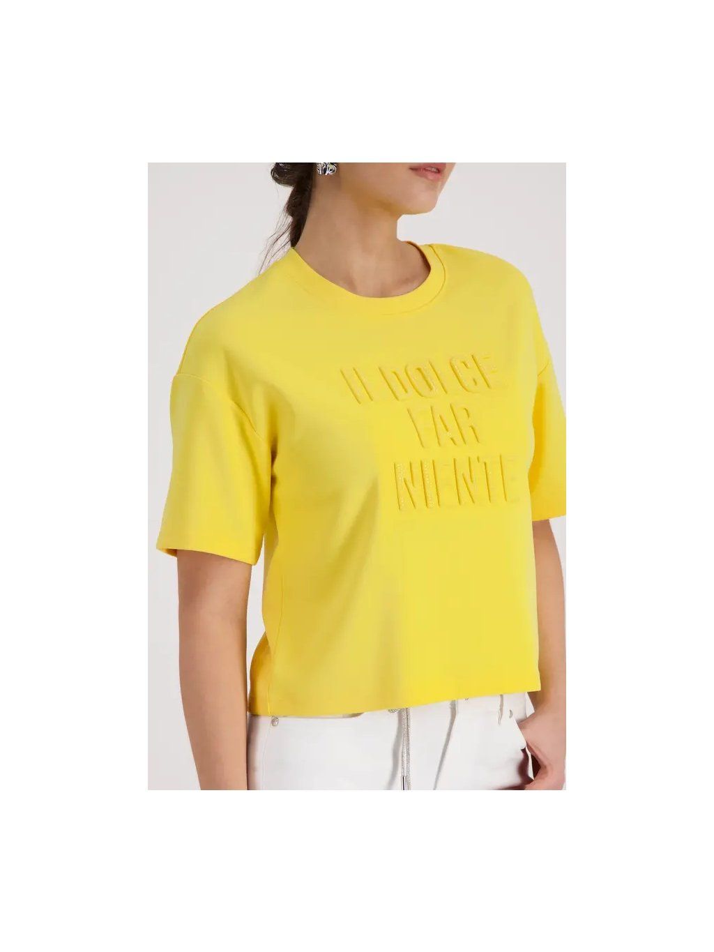 Elegantní tričko z rozevláté viskózy s elastickým materiálem, kulatým výstřihem a třpytivým reliéfním nápisem. Ideální pro sebevědomý vzhled. |
