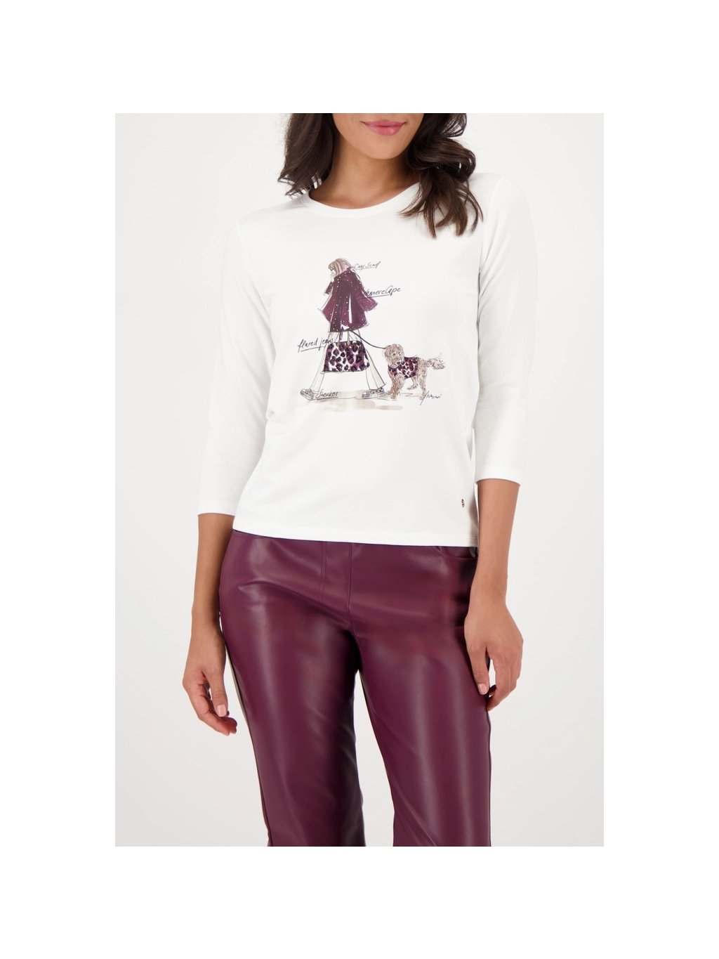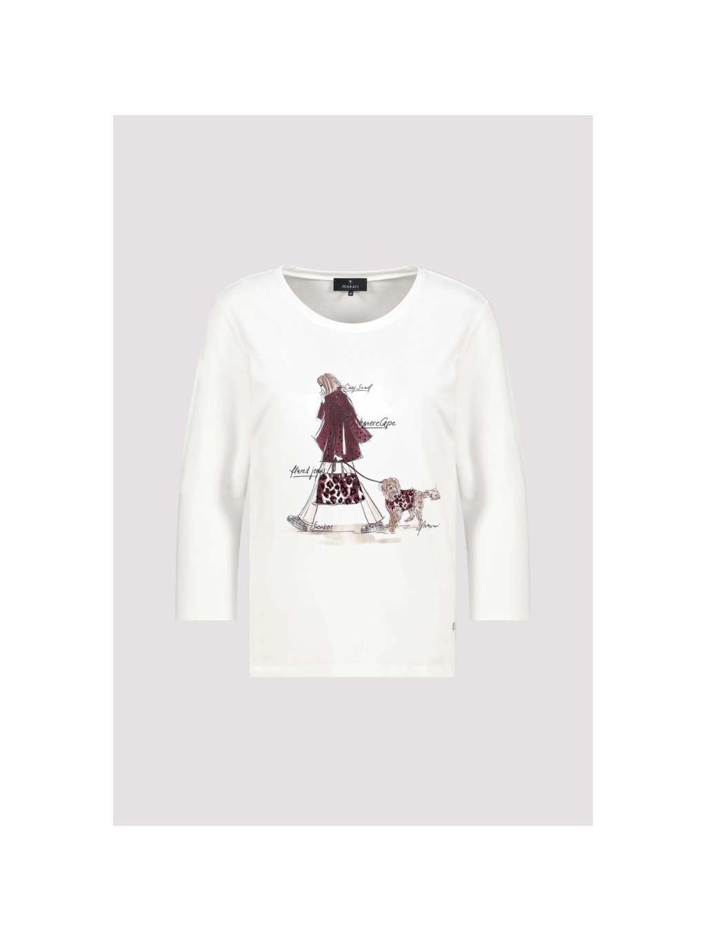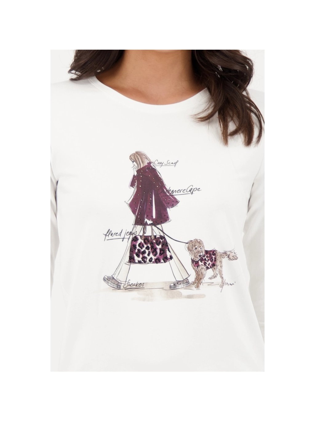 Elegantní tričko ze splývavé viskózy, zdobené potiskem ženy a psa s kamínky, ideální pro ženy, které dbají na styl.