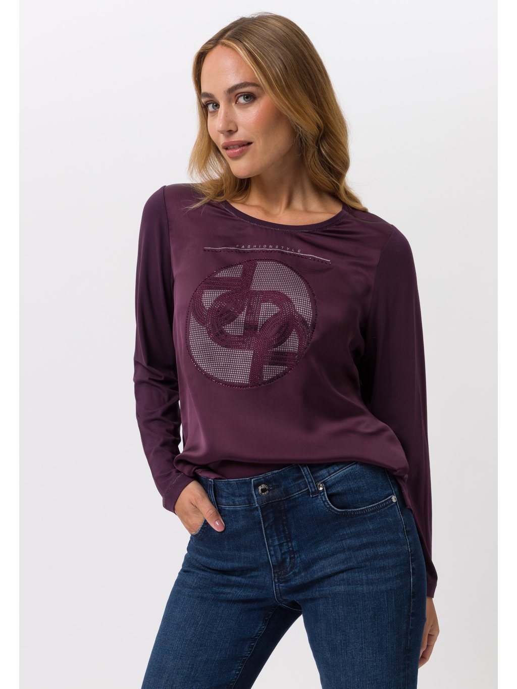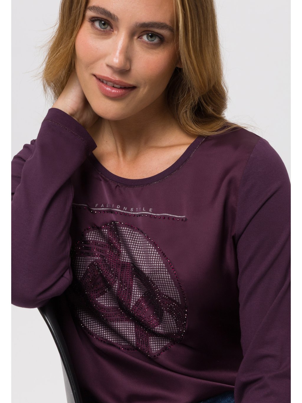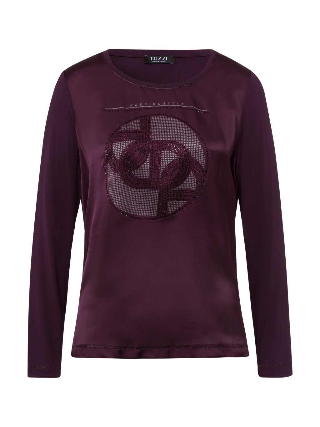 Tričko Tuzzi má přední stranu ze saténu a zdobí ho ornament s kamínky. Tričko má kulatý výstřih, dlouhé rukávy a na bocích rozparky.
