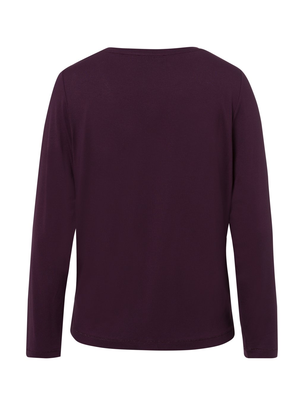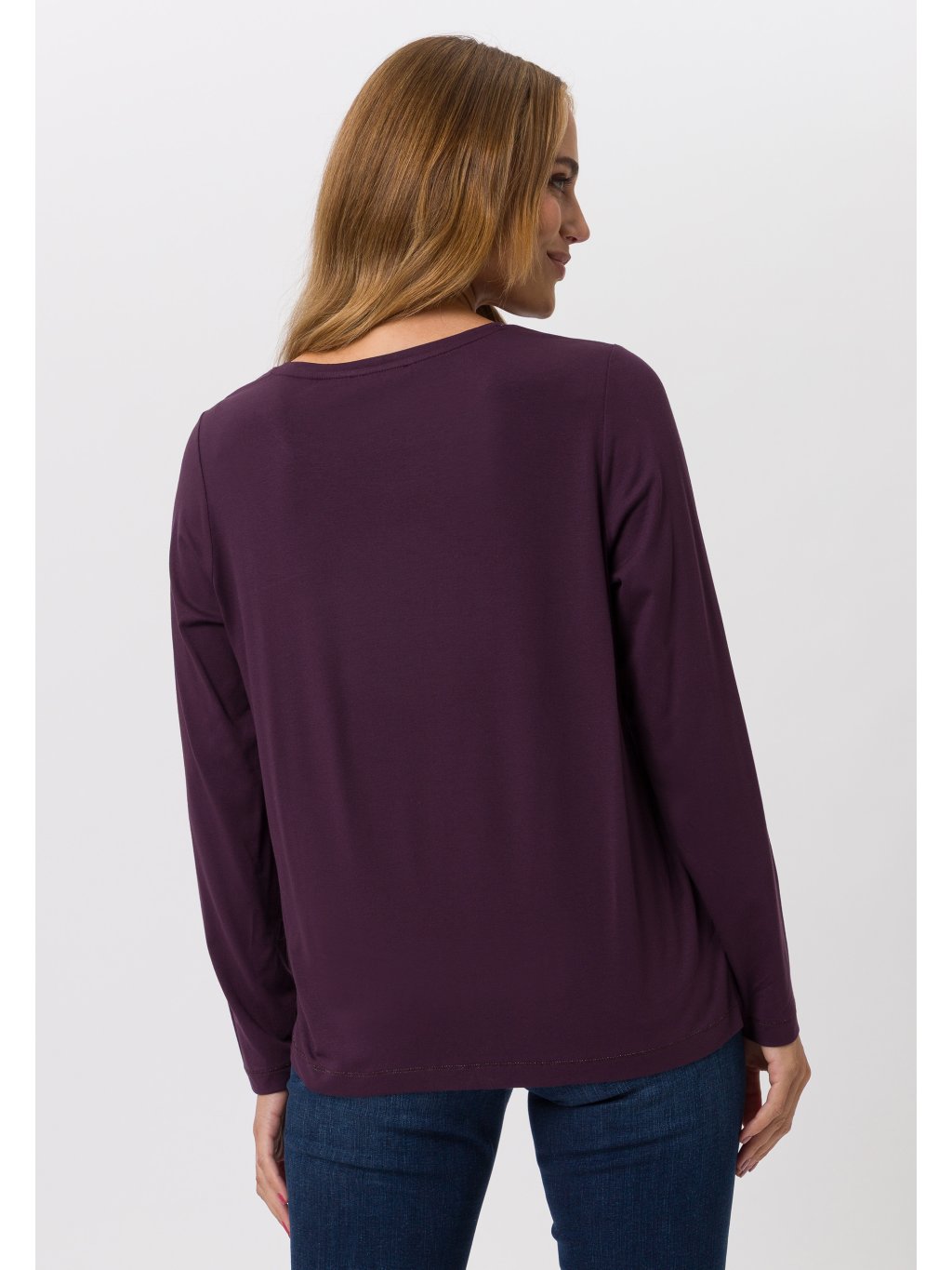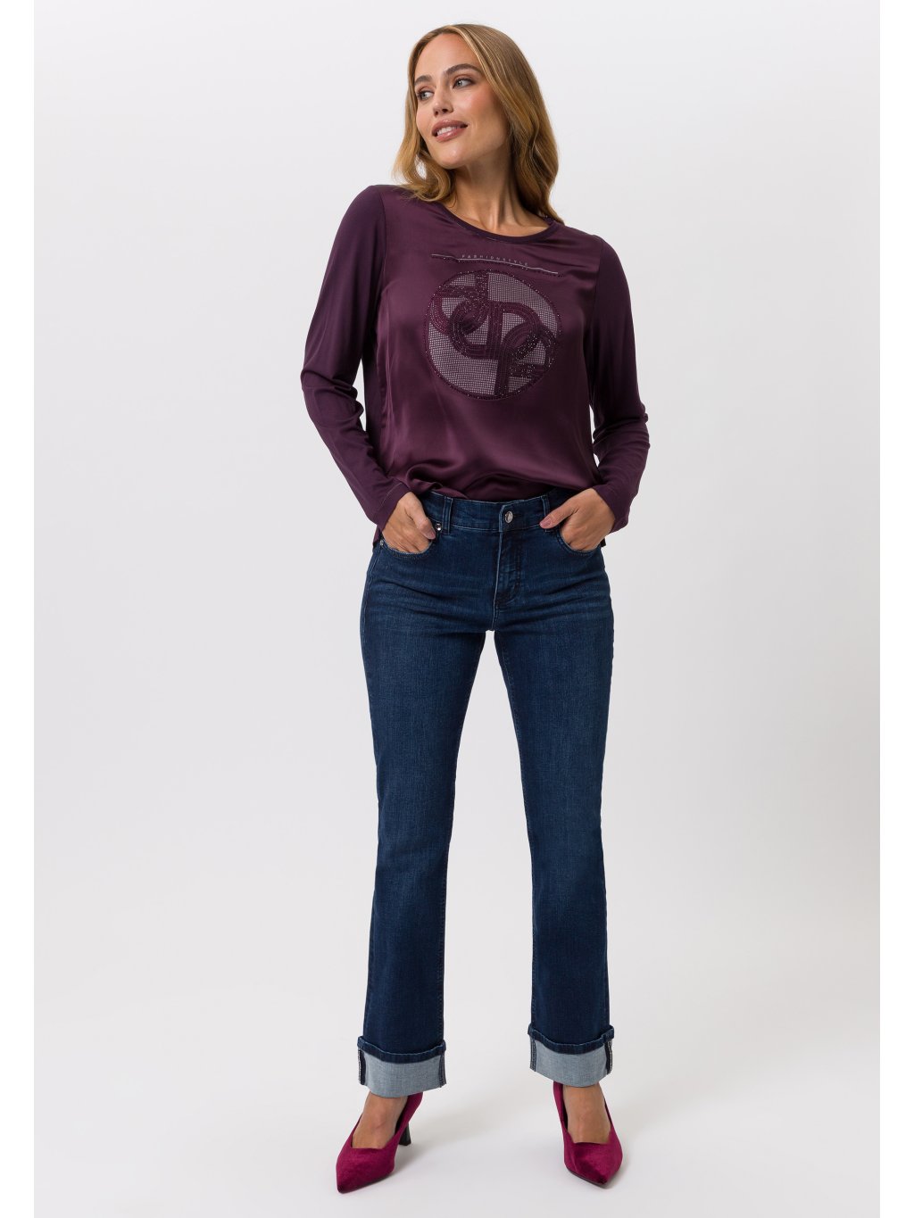 Tričko Tuzzi má přední stranu ze saténu a zdobí ho ornament s kamínky. Tričko má kulatý výstřih, dlouhé rukávy a na bocích rozparky.