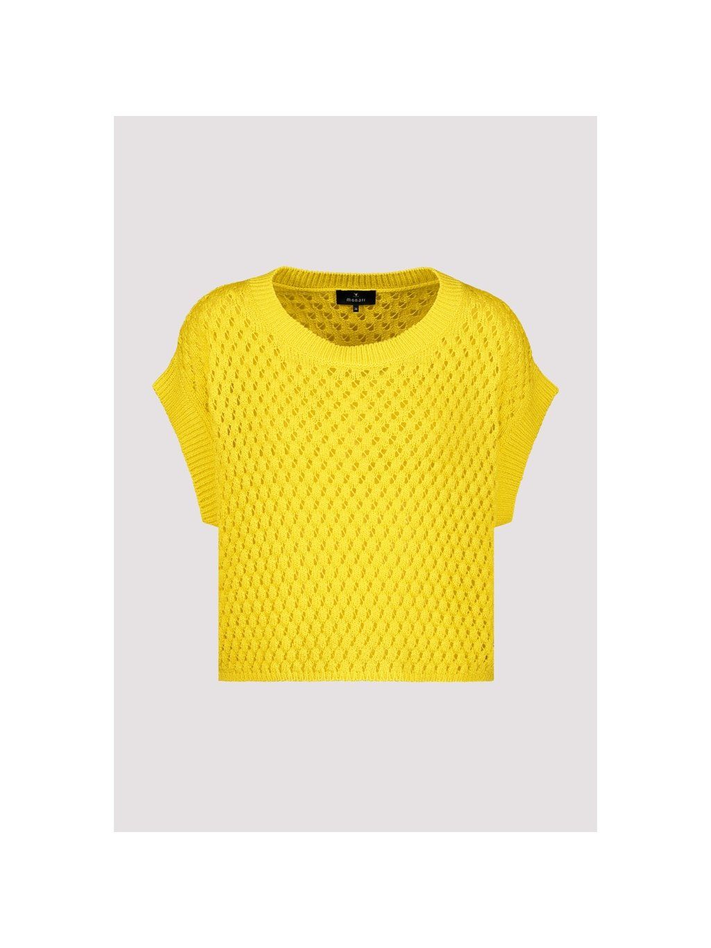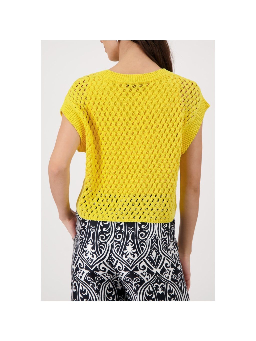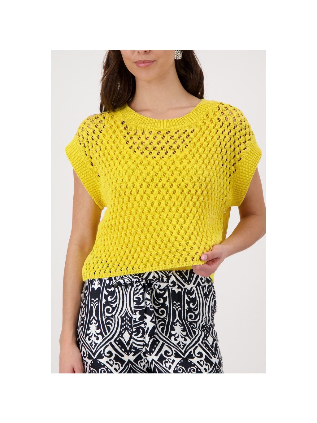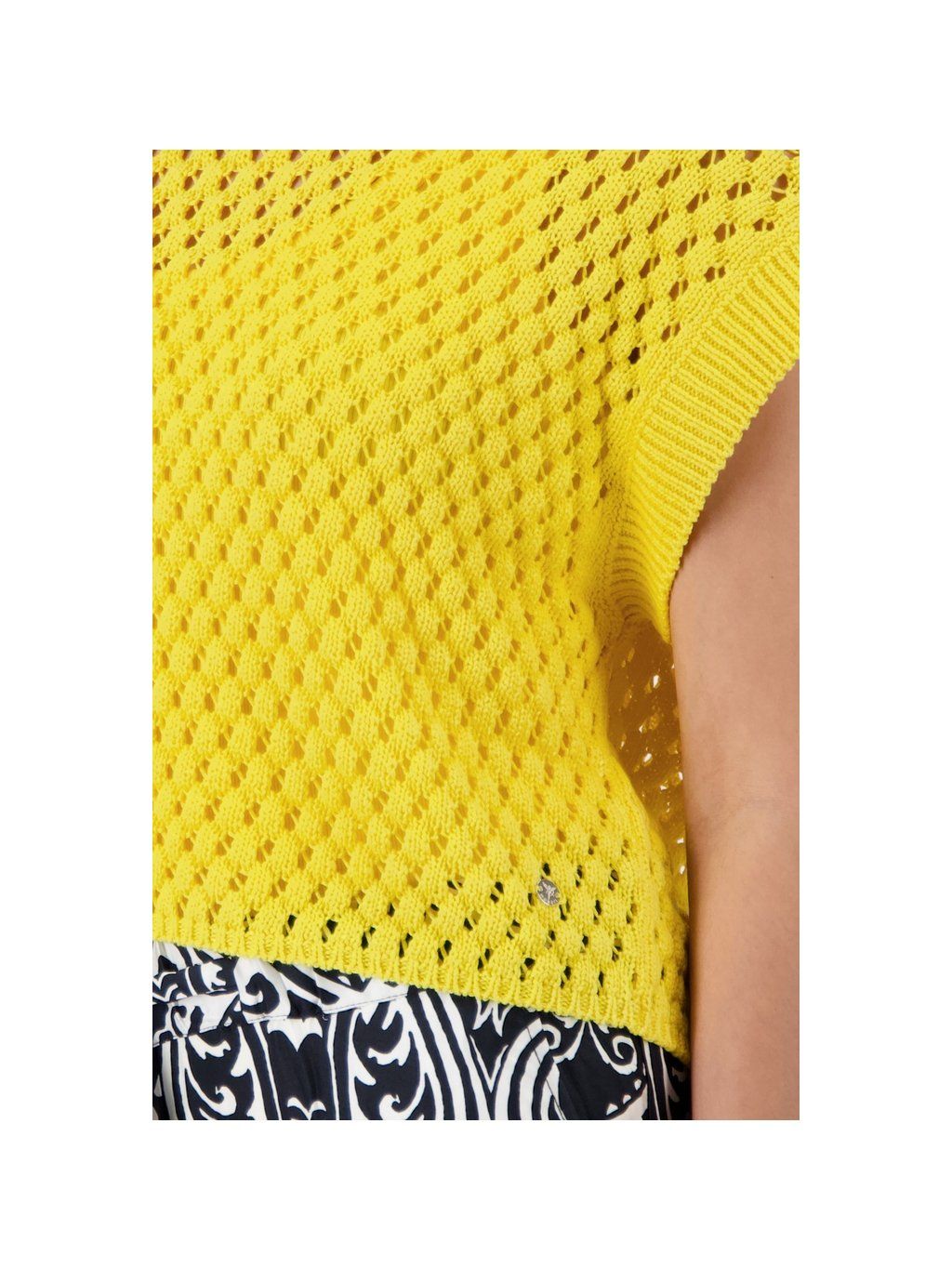 Stylová svetrová vesta s prolamovanou strukturou, kulatým výstřihem a žebrovanými detaily krátkých rukávů pro elegantní vzhled.