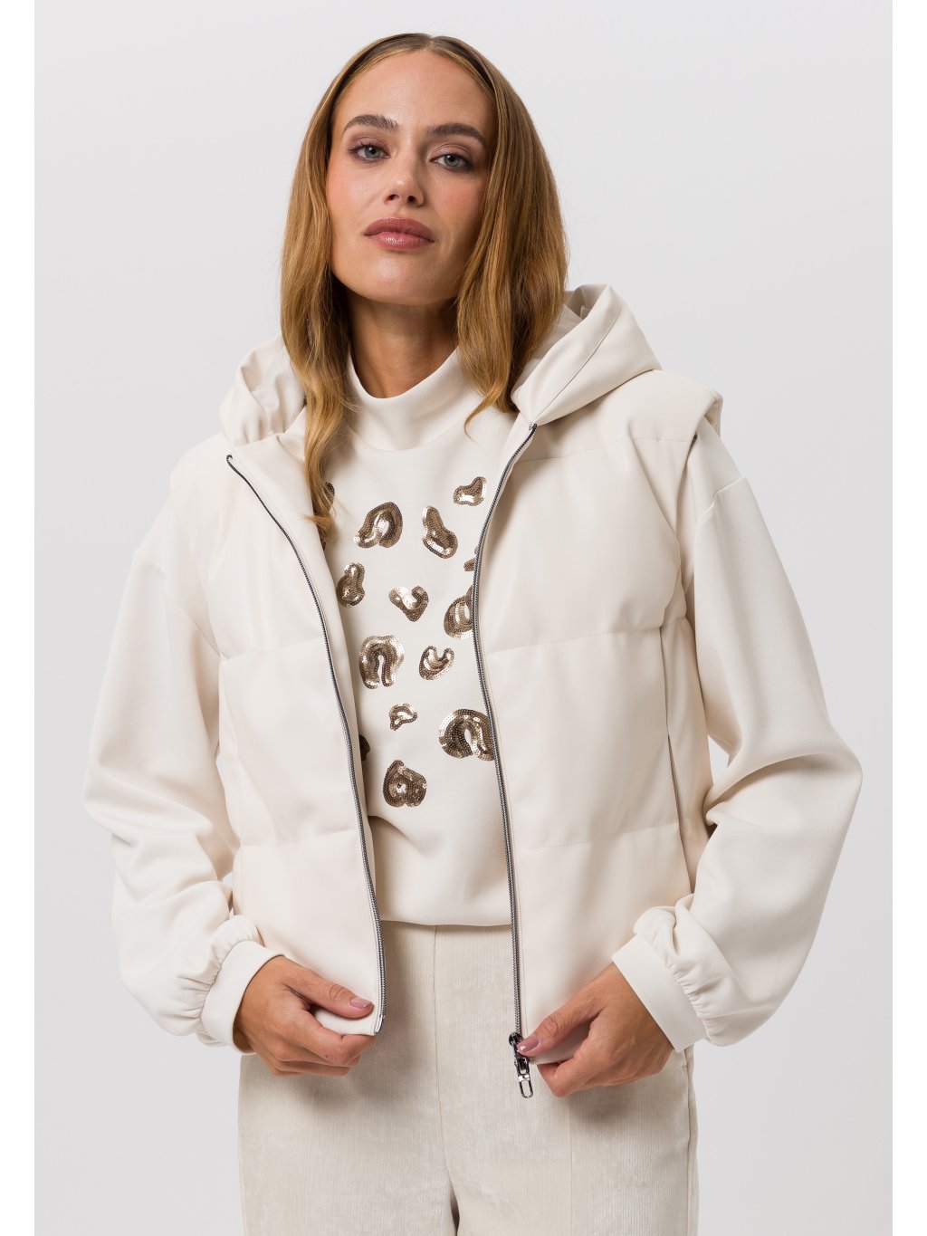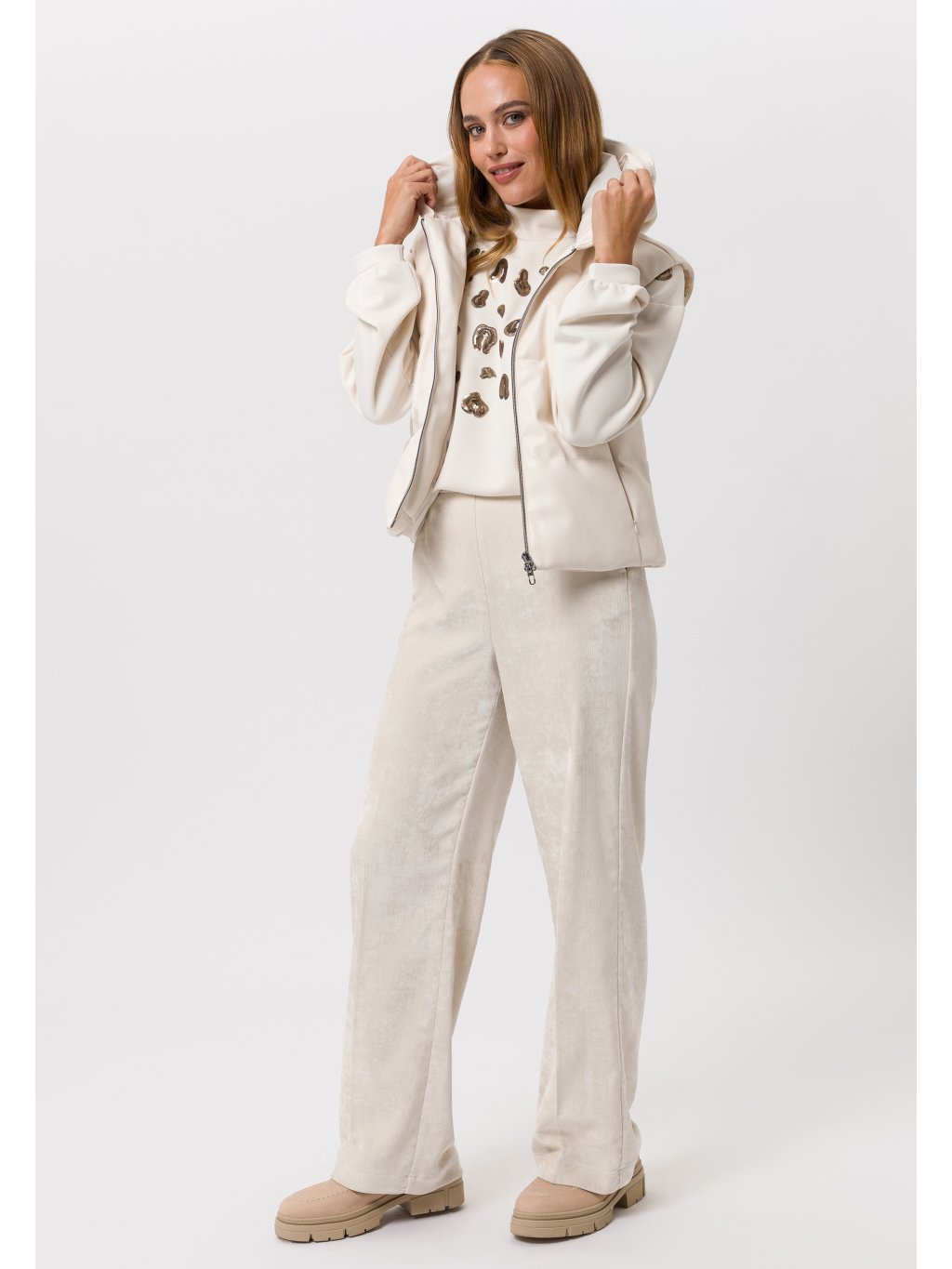 Vesta s kapucí z aktuální kolekce Tuzzi z eko-kůže v jemně béžové barvě je moderním, ale zároveň komfortním kouskem pro chladné období. Díky barvě i jemnému materiálu se snadno kombinuje v elegantním i sportovním stylu. Vesta má kapsy na zip a dvojcestný zip.