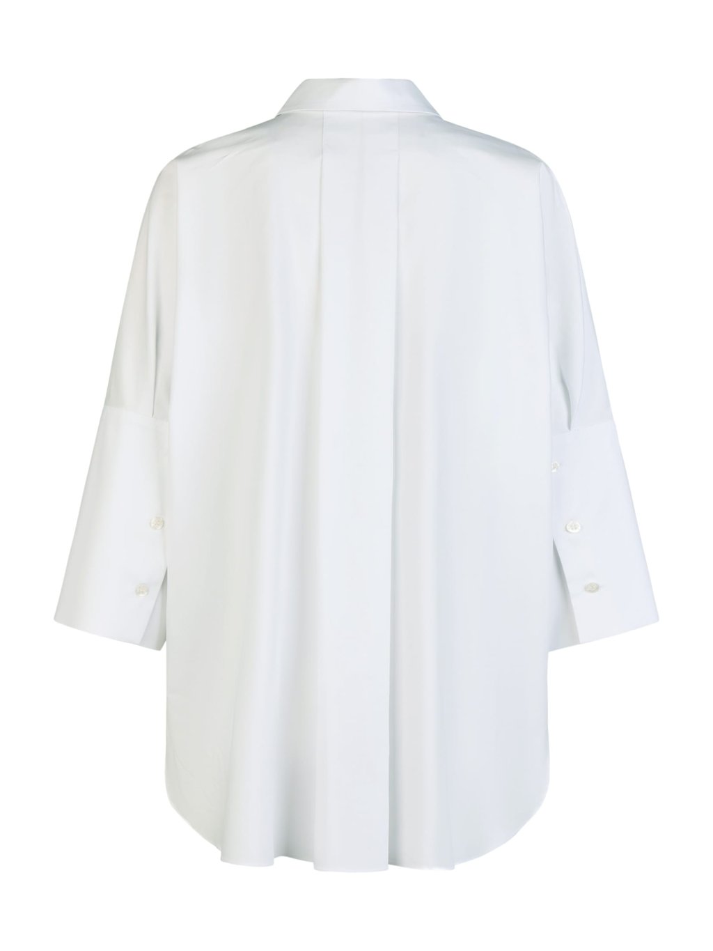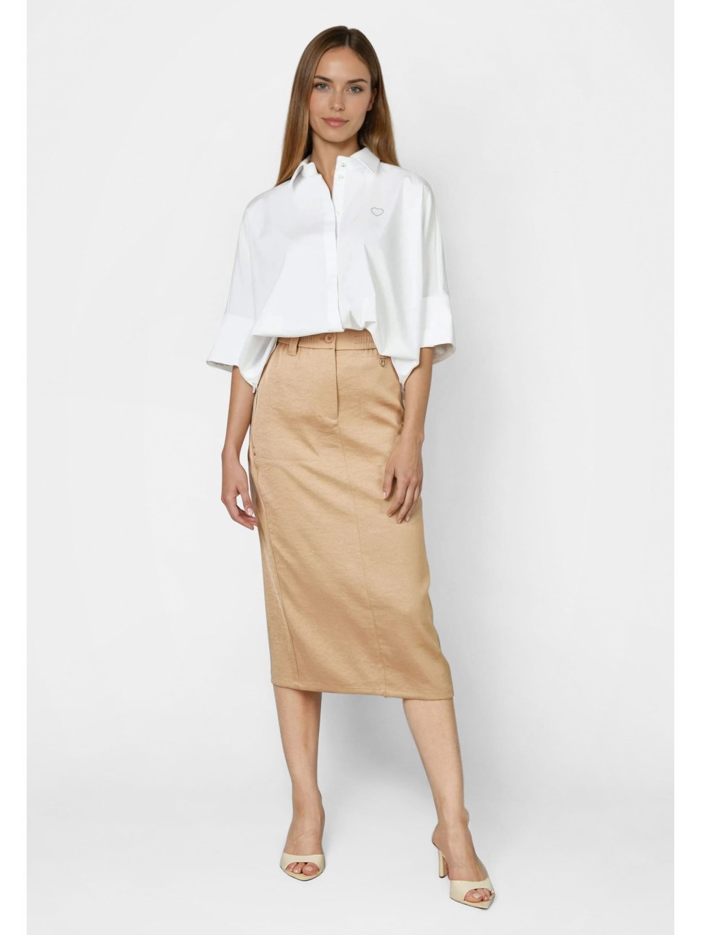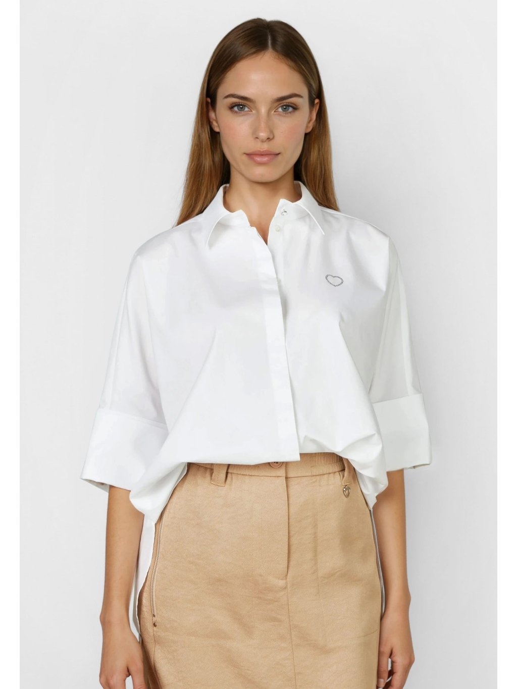 Tato oversized košile z pevné popelínové tkaniny zaujme svou uvolněnou siluetou a třpytivým logem s kamínky. Zkrácené rukávy a elegantní ozdobné knoflíky elegantně doplňují design a dodávají stylové akcenty. Ideální pro módní vzhled.